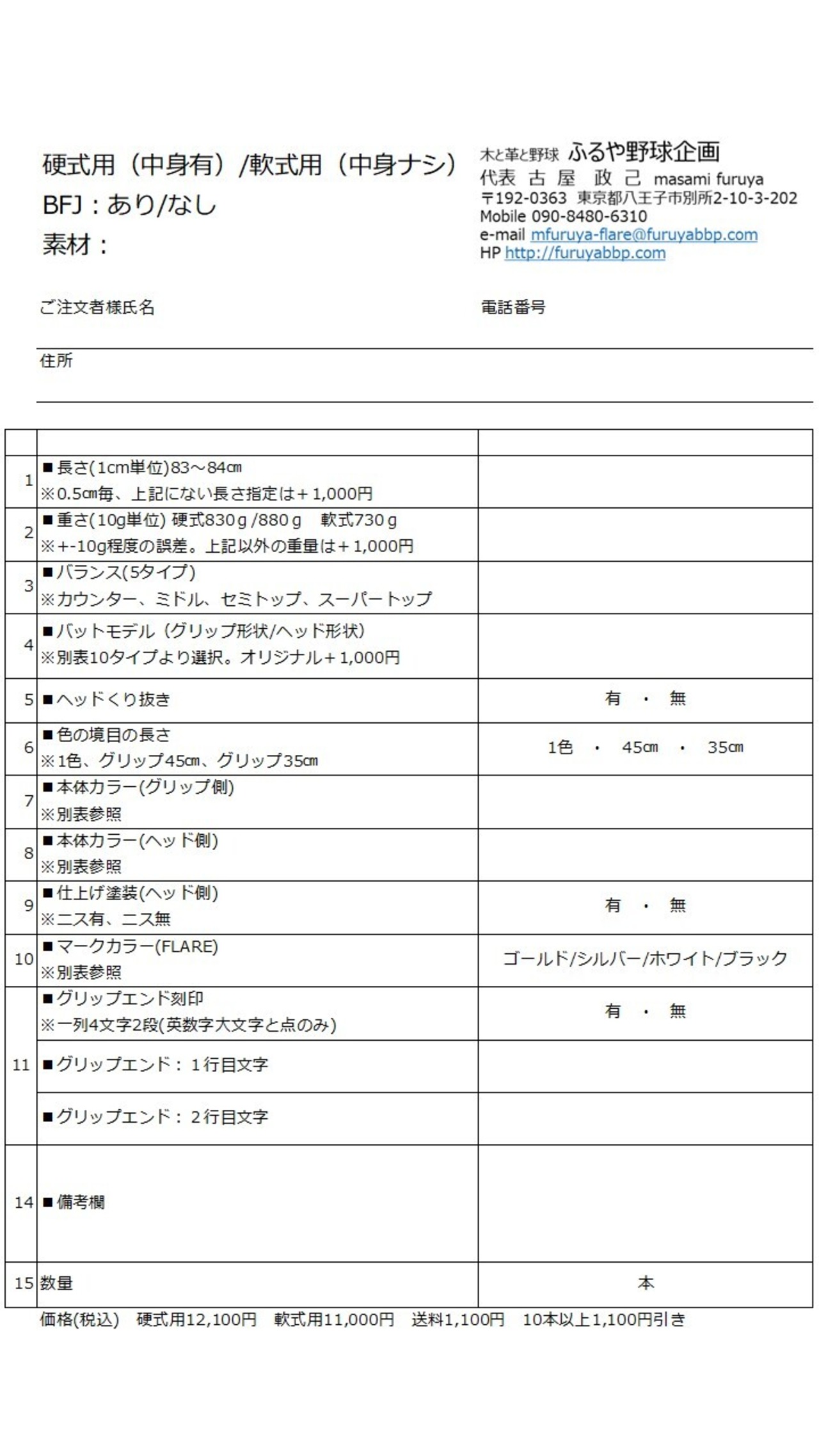 バットの仕様をお選びいただき、発注書の内容でお申込みください。